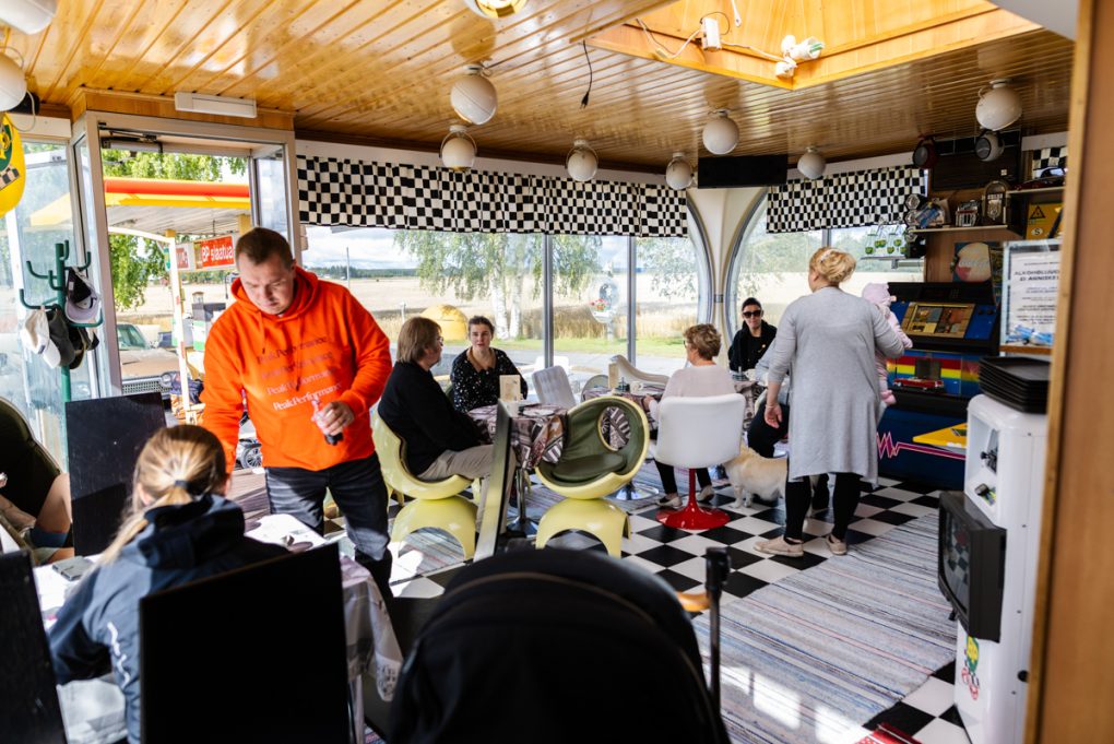 Ja niin todella onkin. Pihassa on autenttinen 70-luvun kylänraitin tunnelma. Huoltoaseman ovet ovat kutsuvasti auki, pannussa tuoksuu kahvi, pihaan on parkkeerannut rivi komeita amerikanrautoja ja jukeboksista soi vanha suomalainen iskelmä 60- ja 70-luvuilta.