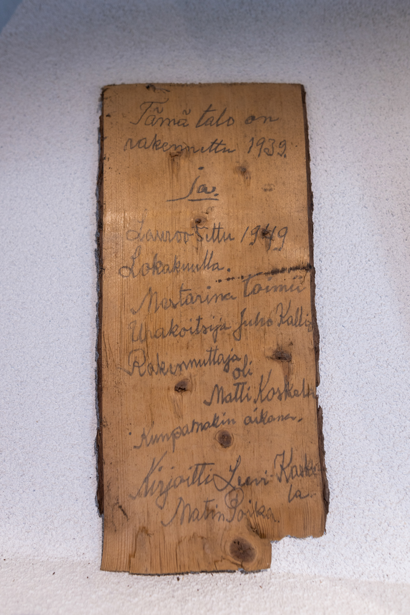 Purkutöiden yhteydessä Riikka Koskelan iho meni ainakin kerran kananlihalle. Silloin, kun vuonna 1939 valmistuneen talon yläkerran hirrestä, sisäkaton alta, löytyi lyijykynällä kirjoitettu teksti: sota on alkanut. Teksti löytyi itsenäisyyspäivän aattona.