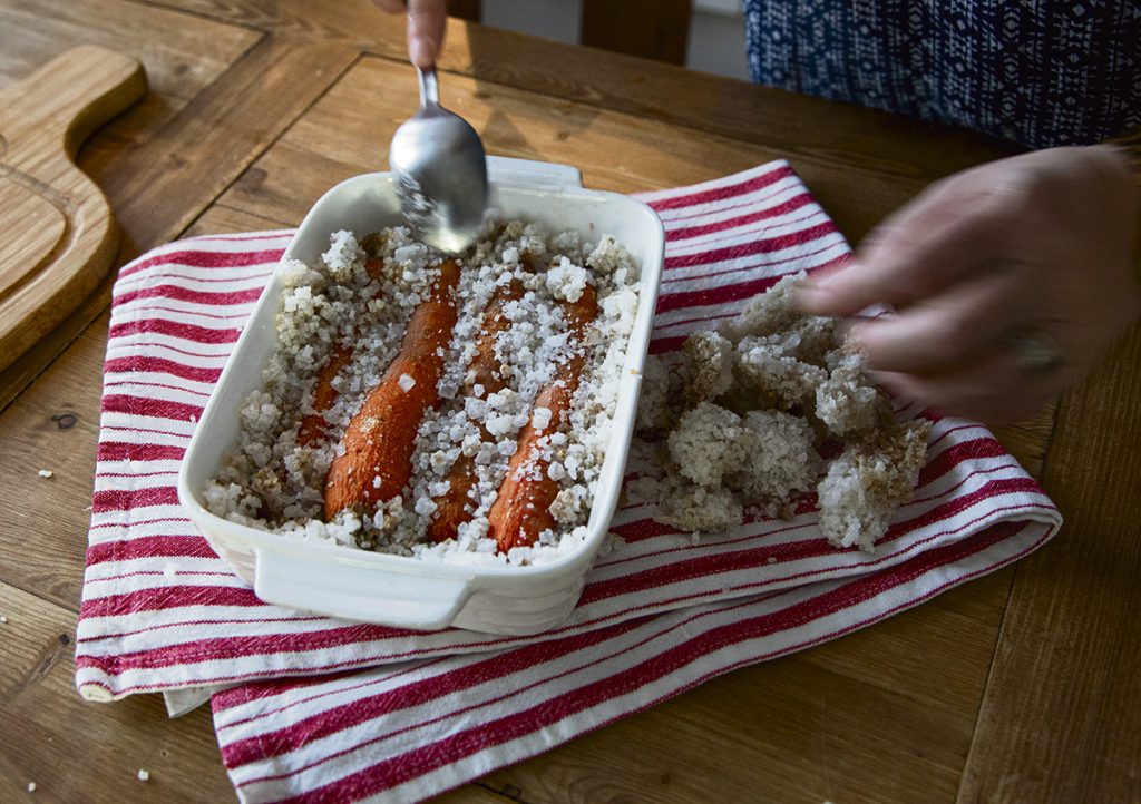 Laita pestyt ja kokonaiset porkkanat suolapedille (karkea merisuola).
