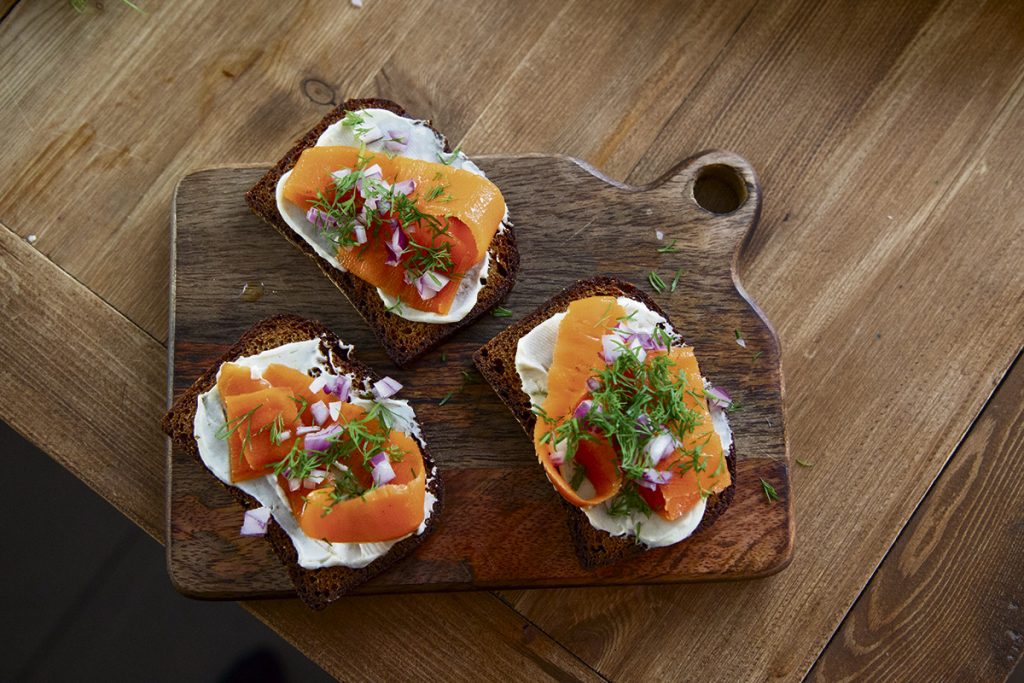 Leivän päällä porkkalan makua korostaa wasabi- tai piparjuuritahnalla maustettu kaurapohjainen levite. Tilli ja punasipuli sekä koristavat että maustavat.