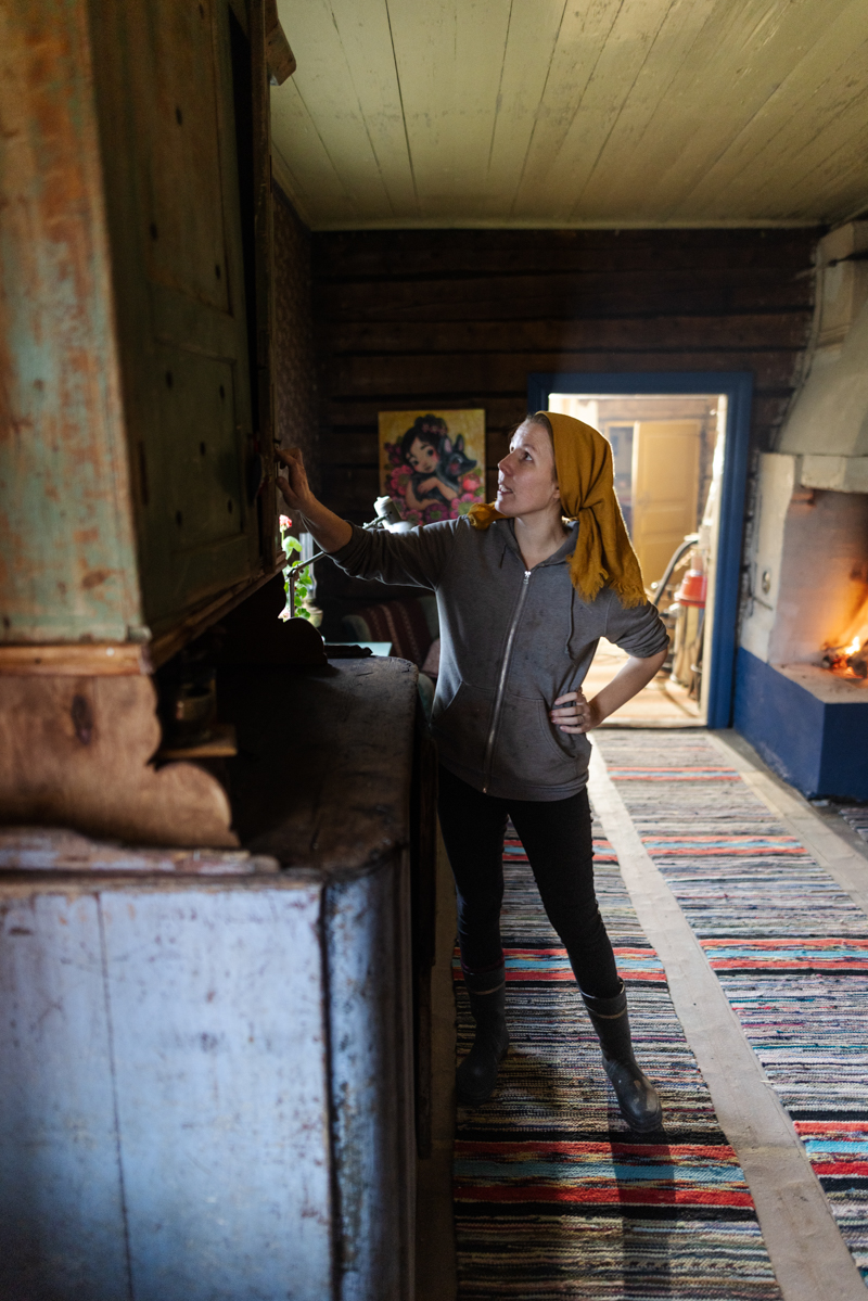 – Kunnostimme myös talon tulisijoja. Kamarin nurkkaan palautimme alkuperäisen mallin mukaisen takan. Edellisen, puuhellan, edessä olevat vanhat lankut olivat hiiltyneet, joten uusi takka on nyt turvallisempi käyttää, Leena Rissa sanoo.